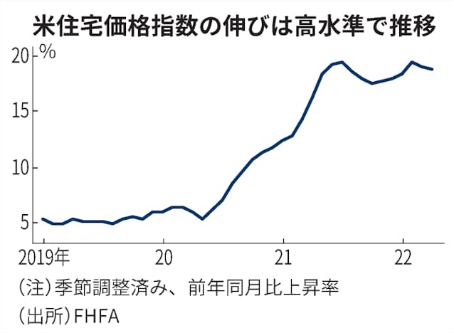 住宅市場は全米の主要都市で上昇が続く。米S&Pダウ・ジョーンズ・インディシーズがまとめる4月のS&Pコアロジック・ケース・シラー指数によると、主要20都市の住宅価格は3月、前年同月比で21%上昇した。南部フロリダ州では30%を超える都市もある。同社のエコノミストは「(利上げにより)価格上昇の鈍化が起きることは予測できるが、いつになるのか見通すのは難しい」と指摘する。