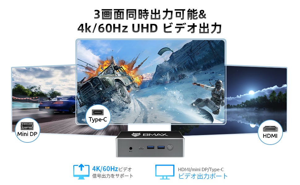 4K UHDの高精細画面と3つのディスプレイ出力に対応。HDMI*2、Type-Cポートを介して、を介して、テレビ、モニター、プロジェクター、プリンターなどを接続できます。3画面同時出力可能で作業効率を向上させ、マルチタスク機能を強化します。コストと管理両方の負担を軽減します。